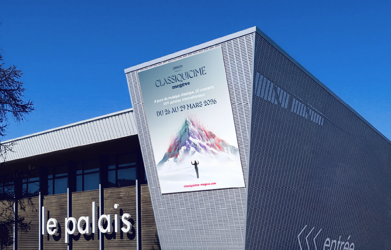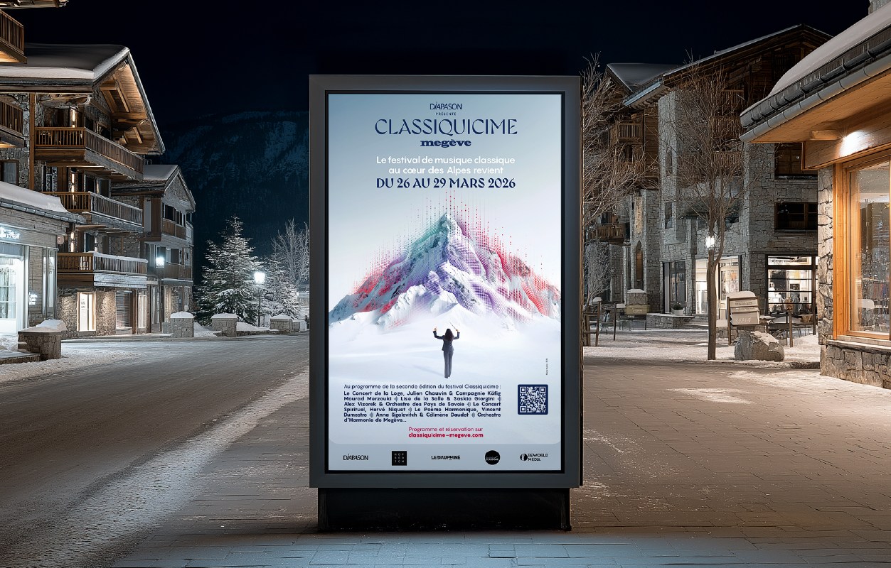 Créé en 2025, le Festival Classiquicime Megève propose une nouvelle façon de vivre la musique classique au cœur des Alpes. À travers une programmation internationale et des formats variés, l’événement s’adresse autant aux passionnés qu’à un public plus large, curieux de découvrir la musique classique autrement. Hopscotch, organisateur du festival, nous a confié la création de l’identité visuelle et du visuel clé, déclinés sur l’ensemble des supports de communication, print et digitaux.